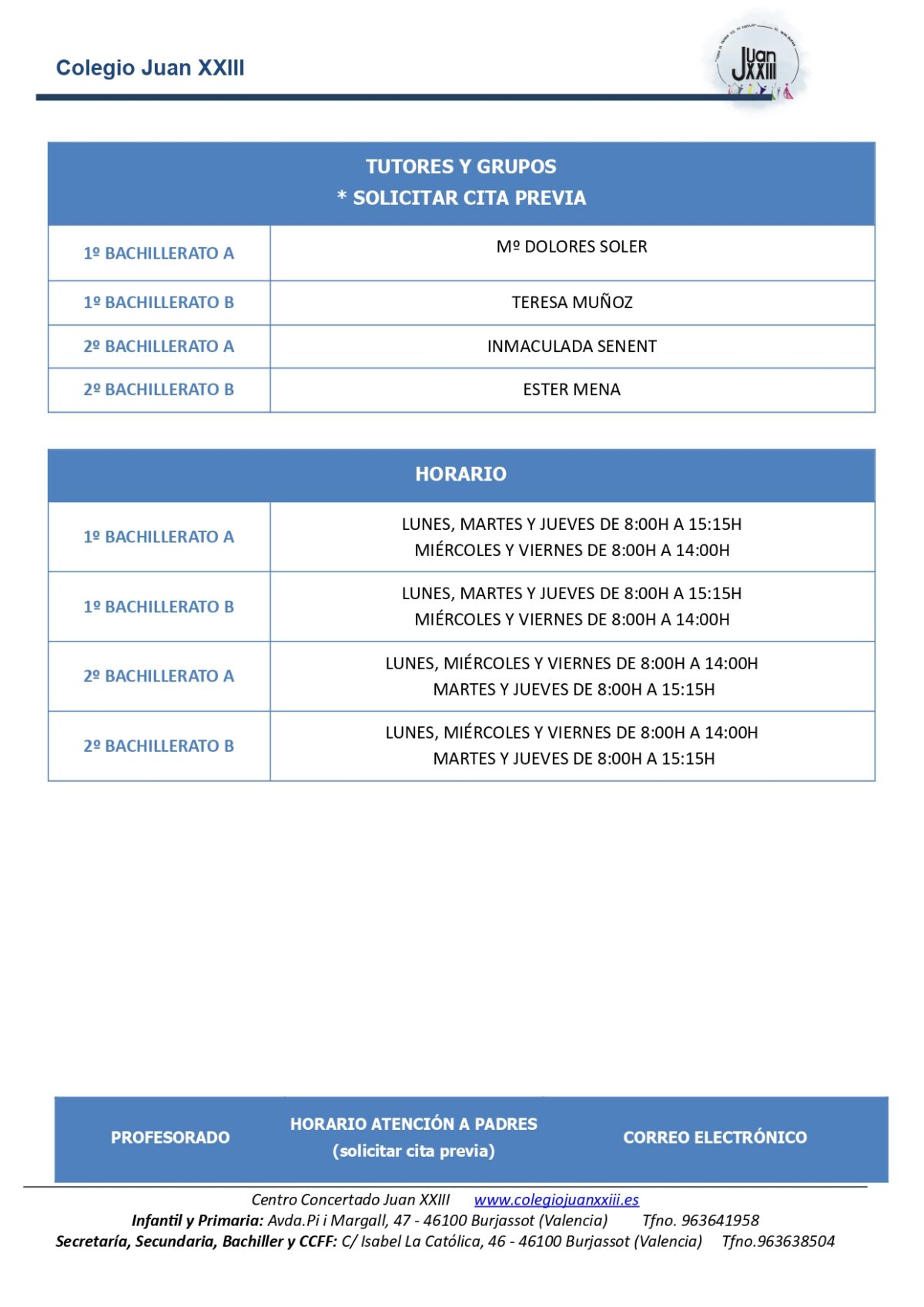 Infantil Primaria 96 364 19 58 / Secundaria Bachiller CCFF 96 363 85 04|juanxxiii@patronatojuanxxiii.com